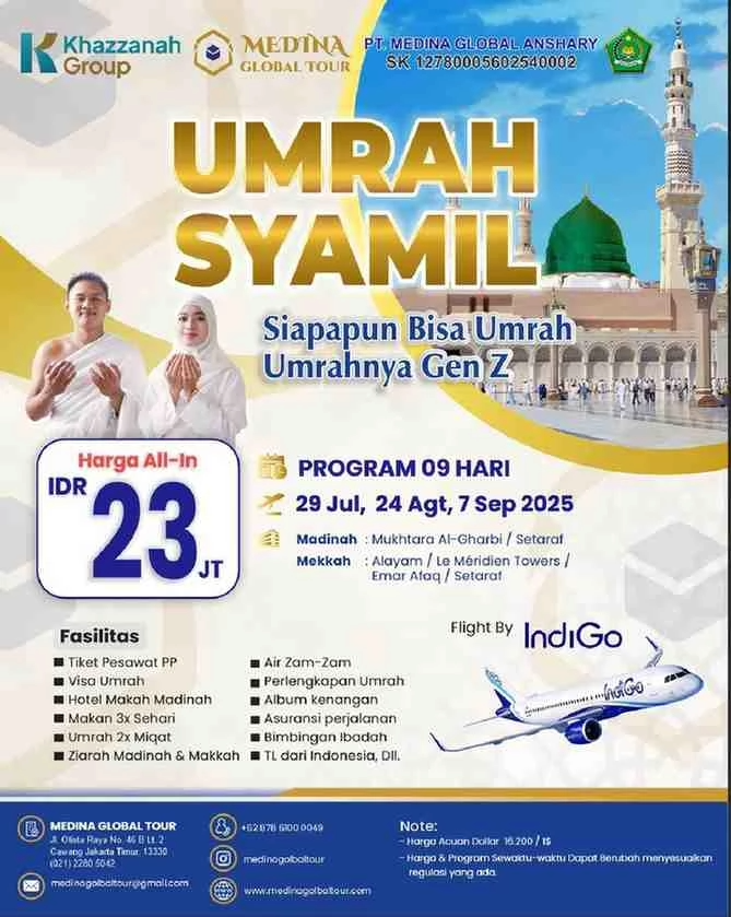 Mengiringi semangat ibadah di penghujung tahun, Khazzanah Tours menghadirkan paket umrah Oktober 2025 dengan harga terjangkau dan layanan berkualitas. Solusi ideal bagi calon jamaah dari Jakarta, Depok, Bekasi, Tangerang, Bogor, dan Bandung yang ingin menunaikan umrah dengan tenang, aman, dan nyaman.